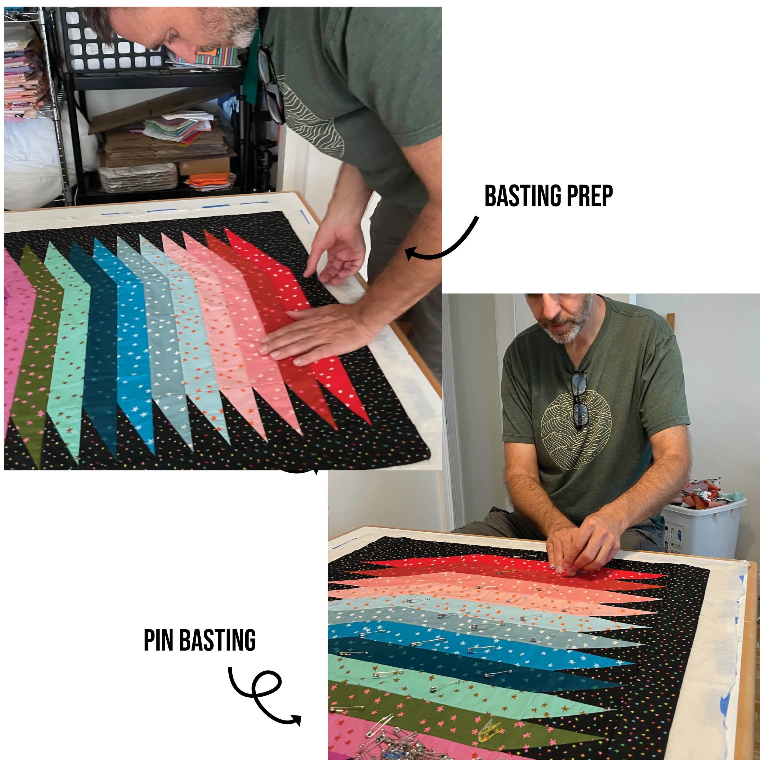 In fact, the only other time I remembered to take work-in-progress shots was when this guy helped me baste the quilt. (On a side note, he’s also straightforward and drama-free!). This is my husband’s first time basting and because I covered all the quilting steps in the Modern Landscape Quilts book, he read and followed the basting section to a T. 🥳